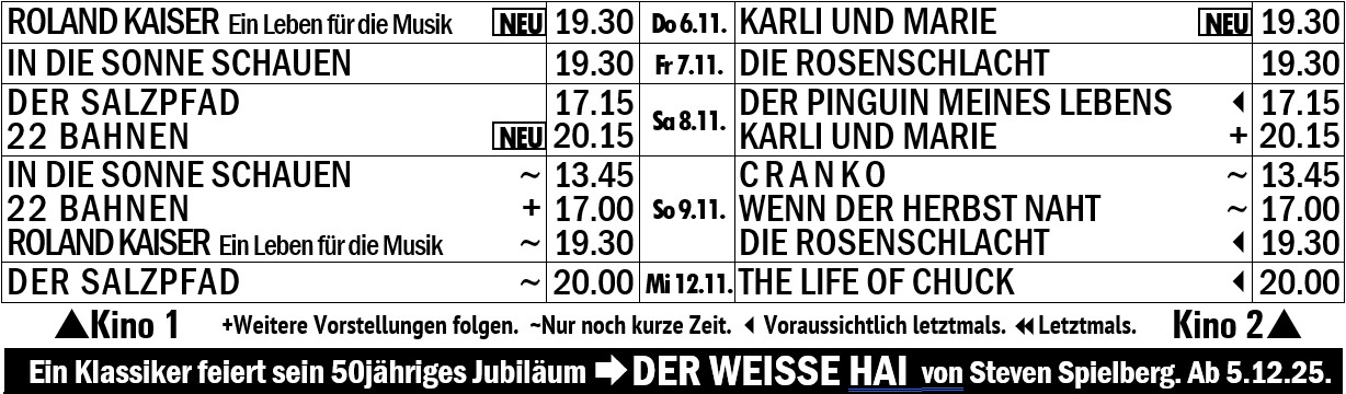 Für Ihren Kinobesuch informieren Sie sich bitte taggenau, da Filme und Spielzeiten täglich variieren. Vielen Dank.