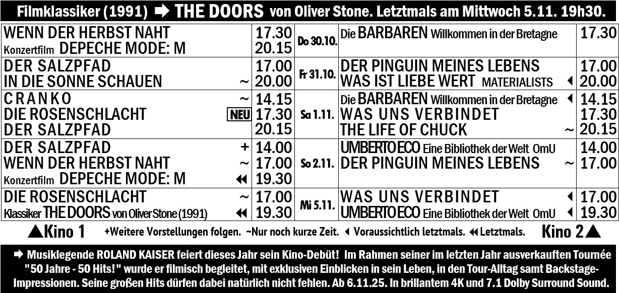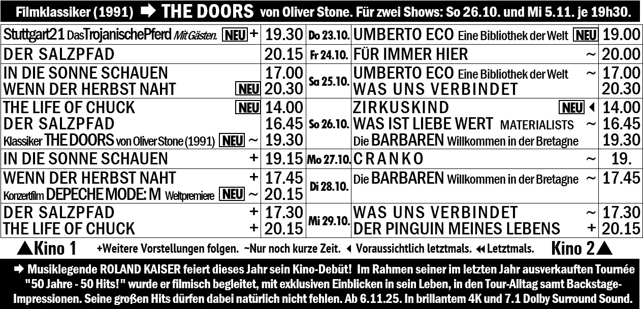 Für Ihren Kinobesuch informieren Sie sich bitte taggenau, da Filme und Spielzeiten täglich variieren. Vielen Dank.